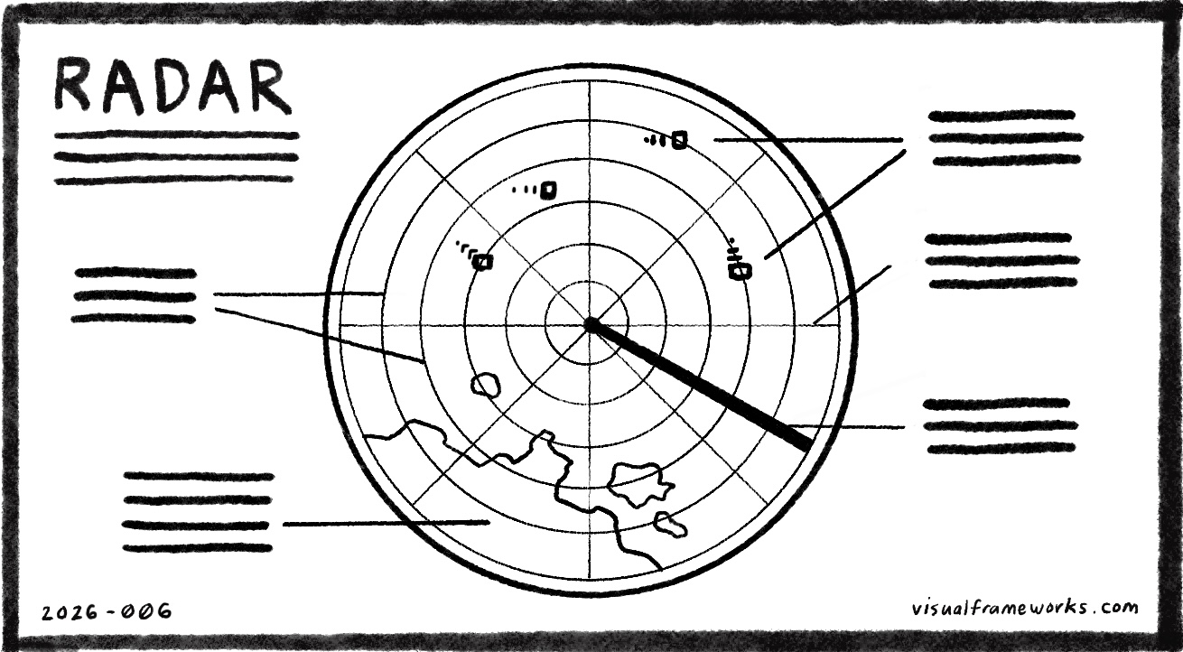 A radar sends out pulses of radio energy and listens for what comes back. The rotating sweep of the radar display paints a picture of the surrounding space: what’s near, what’s distant, what’s moving, what’s closing in. Nothing on the screen is certain. Radar shows echoes, not objects. But it gives you a sense of what’s around you before it comes into view.